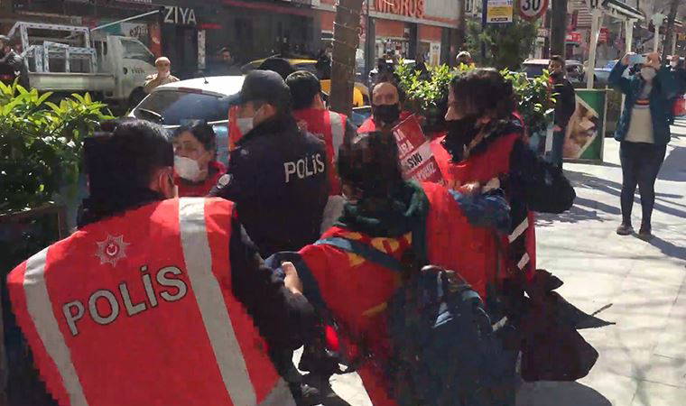 Polis, Emekçi Hareket Partisi üyesi 11 kişiyi yaka paça gözaltına aldı. Müdahale sırasında koronavirüs önlemlerini hiçe sayan polis, eylemcilerin ağızlarını elleriyle kapattı, bazılarına ters kelepçe taktı.