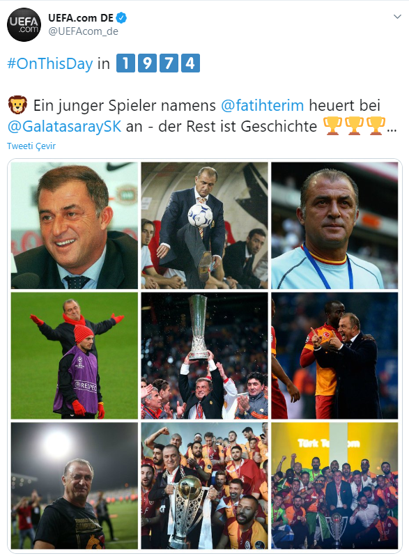 UEFA'nın resmi twitter hesabından yapılan paylaşımda: "1974'te bugün. Galatasaray, Fatih Terim adında genç birini aldı ve gerisi tarih oldu." ifadelerine yer verildi.