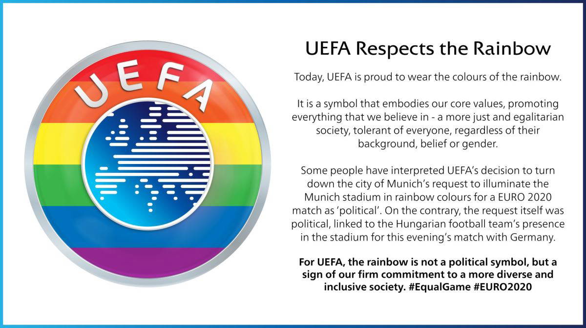 Bazıları, UEFA'nın Münih şehrinin Münih stadyumunu EURO 2020 maçı için gökkuşağı renklerinde aydınlatma talebini geri çevirme kararını 'politik' olarak yorumladı. Ancak aksine, talebin kendisi siyasiydi ve Macar futbol takımının bu akşam Almanya ile oynayacağı maç için stadyumdaki varlığıyla ilişkiliydi. UEFA için gökkuşağı siyasi bir sembol değil, daha çeşitli ve kapsayıcı bir topluma olan sıkı bağlılığımızın bir işaretidir."