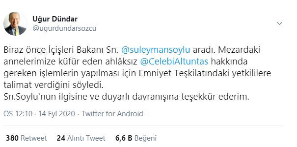 Altuntaş hakkında işlem başlatılması çağrısı yapan Uğur Dündar’ı ise İçişleri Bakanı Süleyman Soylu telefonla aradı. Soylu söz konusu şahısla ilgili gerekli işlemlerin yapılması için Emniyet teşkilatına talimat verdiğini söyledi.