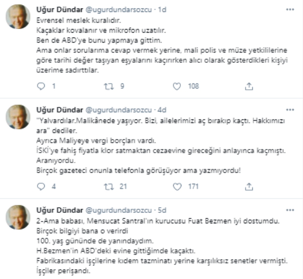 "Evrensel meslek kuralıdır. Kaçaklar kovalanır ve mikrofon uzatılır. Ben de ABD'ye bunu yapmaya gittim" diyen Uğur Dündar, "Ama onlar sorularıma cevap vermek yerine, mali polis ve müze yetkililerine göre tarihi değer taşıyan eşyalarını kaçırırken alıcı olarak gösterdikleri kişiyi üzerime sadırttılar" diye yazdı.