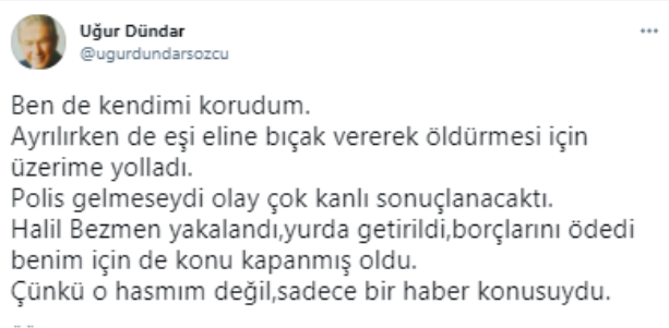 Uğur Dündar'ın Twitter hesabından yaptığı açıklama şöyle: