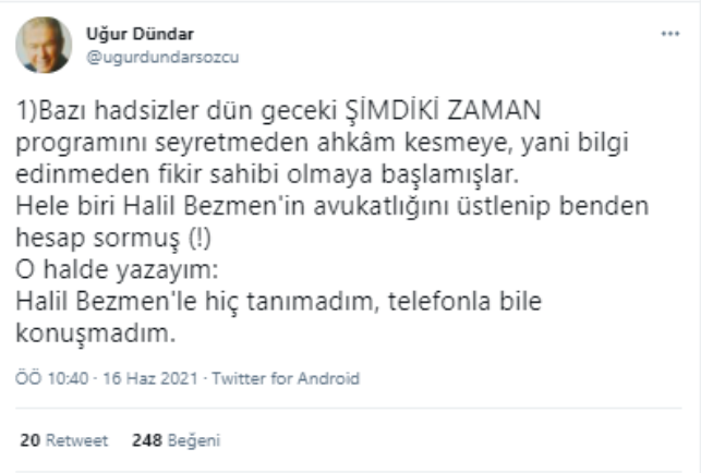 - Bazı hadsizler dün geceki ŞİMDİKİ ZAMAN programını seyretmeden ahkâm kesmeye, yani bilgi edinmeden fikir sahibi olmaya başlamışlar. Hele biri Halil Bezmen'in avukatlığını üstlenip benden hesap sormuş (!) O halde yazayım: Halil Bezmen'le hiç tanımadım, telefonla bile konuşmadım.