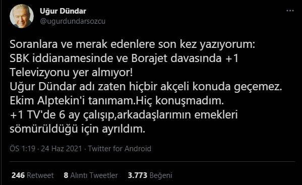 "Soranlara ve merak edenlere son kez yazıyorum: SBK iddianamesinde ve Borajet davasında +1 Televizyonu yer almıyor! Uğur Dündar adı zaten hiçbir akçeli konuda geçemez. Ekim Alptekin'i tanımam. Hiç konuşmadım. +1 TV'de 6 ay çalışıp,arkadaşlarımın emekleri sömürüldüğü için ayrıldım."