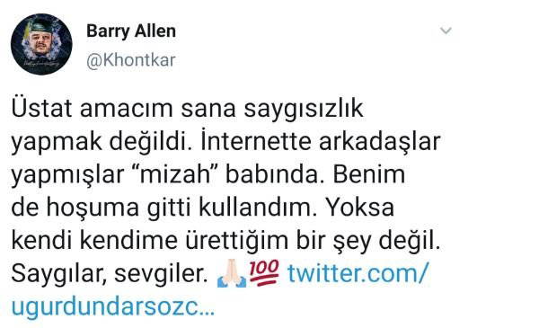 "Üstat amacım sana saygısızlık yapmak değildi. İnternette arkadaşlar yapmışlar “mizah” babında. Benim de hoşuma gitti kullandım. Yoksa kendi kendime ürettiğim bir şey değil. Saygılar, sevgiler."