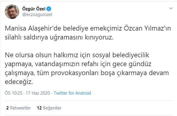 "Manisa Alaşehir'de belediye emekçimiz Özcan Yılmaz'ın silahlı saldırıya uğramasını kınıyoruz. Ne olursa olsun halkımız için sosyal belediyecilik yapmaya, vatandaşımızın refahı için gece gündüz çalışmaya, tüm provokasyonları boşa çıkarmaya devam edeceğiz."