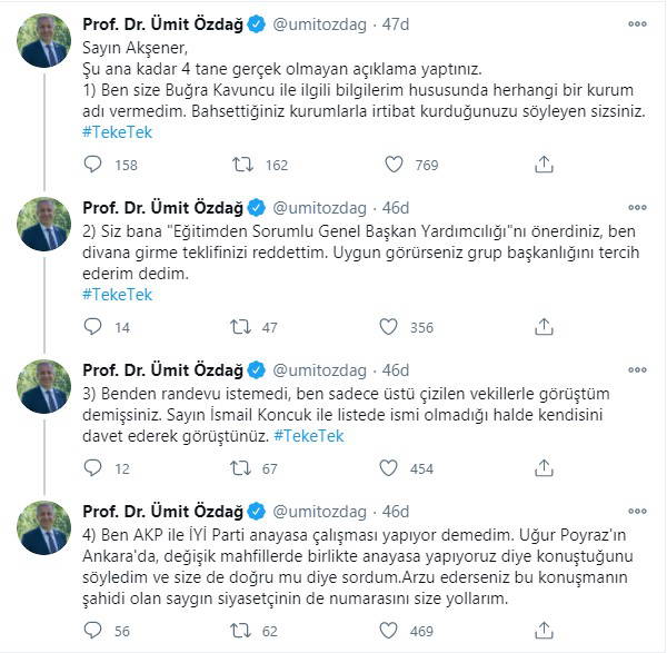 İYİ Parti Genel Başkanı Meral Akşener, Habertürk'te Teke Tek programında Fatih Altaylı'nın gündeme ilişkin sorularını yanıtladı. Akşener, Ümit Özdağ'ın partiden ihraç edilmesiyle ilgili konuştu. Akşener, ''Buğra Kavuncu ile ilgili olarak bana geldi ve kongremiz vardı. Buğra'nın FETÖ'cü olduğunu söyledi. Ben de kendisine konuyla ilgili belge ve bilgi getirmesini gereğini yapacağımı söyledim. Sonra gelindi belge ve bilgi yok. Bu bilgiler nereden? O da devletin bazı kurumlarını söyledi'' ifadelerini kullandı. Akşener'in konuşması devam ettiği sırada Ümit Özdağ sosyal medya hesabından Akşener'e yanıt verdi.
