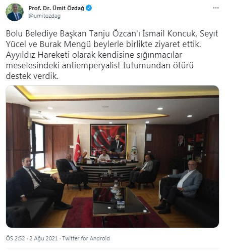 "Bolu Belediye Başkan Tanju Özcan'ı İsmail Koncuk, Seyıt Yücel ve Burak Mengü beylerle birlikte ziyaret ettik. Ayyıldız Hareketi olarak kendisine sığınmacılar meselesindeki antiemperyalist tutumundan ötürü destek verdik."