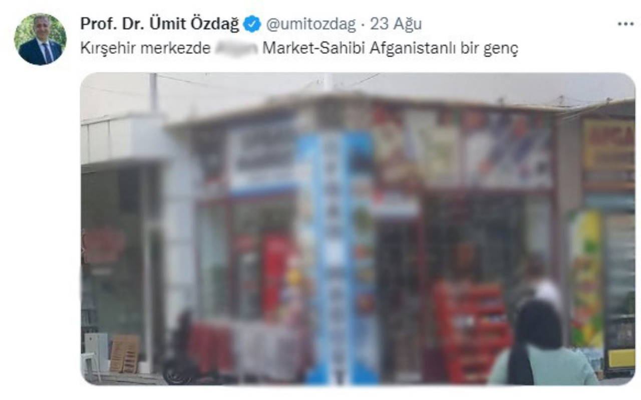 İstanbul Milletvekili Ümit Özdağ, bir süre önce sosyal medya hesabından, Afganistanlı M.S'nin işlettiği marketin fotoğrafını paylaşarak, "Kırşehir merkezde Afgan Market-Sahibi Afganistanlı bir genç" ifadelerini kullandı.
