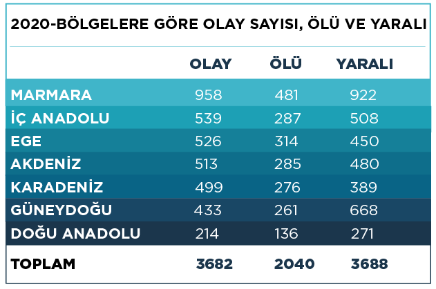 Karadeniz Bölgesi’nde 2020’de iller bazında yaşanan olay sayıları şöyle: Çorum 62, Zonguldak 48, Trabzon 36, Ordu 31, Düzce 27, Kastamonu 24, Tokat 15, Rize 15, Sinop 11, Giresun 10, Karabük 9, Gümüşhane 8, Bartın 6, Amasya 4, Bolu 3, Bayburt 2, Artvin 1.