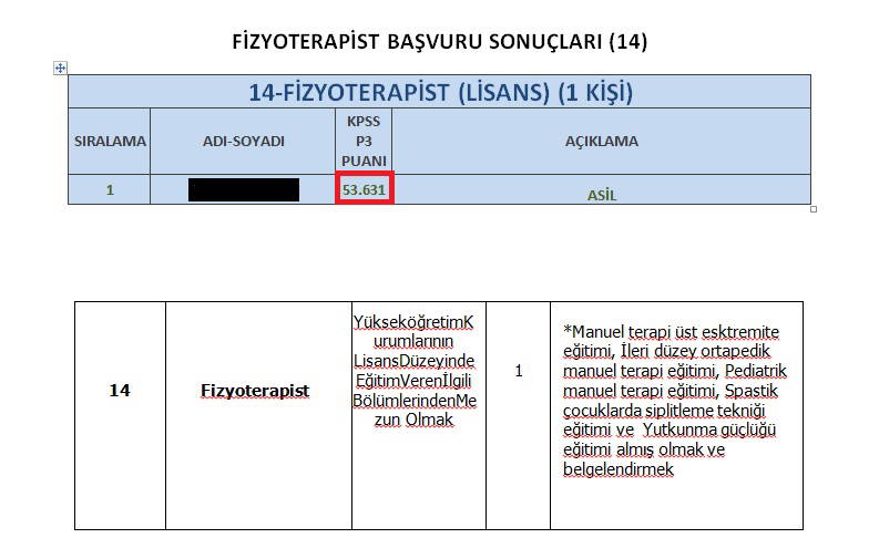 KPSS ön şartı olduğu için genelde 80 puan altı alan kimsenin başvuramadığı bölüme, Selçuk Üniversitesi'nde ilgili bölümünün aradığı özel kriterlere uyan tek kişi ise 53,631 KPSS puanıyla fizyoterapist olarak göreve atandı.