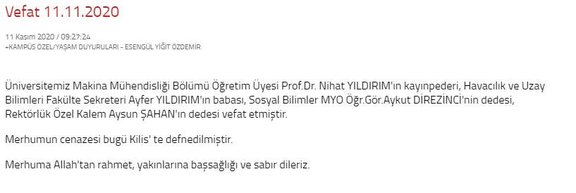 "Üniversitemiz Makina Mühendisliği Bölümü Öğretim Üyesi Prof.Dr. Nihat YILDIRIM'ın kayınpederi, Havacılık ve Uzay Bilimleri Fakülte Sekreteri Ayfer YILDIRIM'ın babası, Sosyal Bilimler MYO Öğr.Gör.Aykut DİREZİNCİ'nin dedesi, Rektörlük Özel Kalem Aysun ŞAHAN'ın dedesi vefat etmiştir."