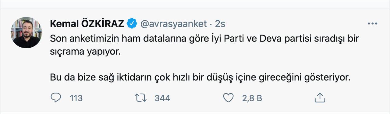 Avrasya Araştırma Başkanı Kemal Özkiraz, sosyal medya hesabından yaptığı açıklamada İYİ Parti ve Deva Partisi'nin sıra dışı bir sıçrama yaptığını belirtti.