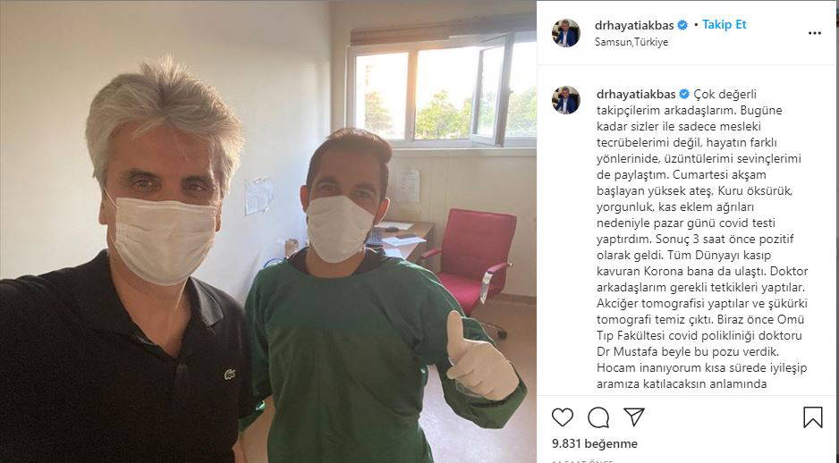"Çok değerli takipçilerim arkadaşlarım. Bugüne kadar sizler ile sadece mesleki tecrübelerimi değil, hayatın farklı yönlerini, üzüntülerimi sevinçlerimi de paylaştım. Cumartesi akşam başlayan yüksek ateş, Kuru öksürük,yorgunluk, kas eklem ağrıları nedeniyle pazar günü Covid19 testi yaptırdım. Sonuç 3 saat önce pozitif olarak geldi. Tüm dünyayı kasıp kavuran korona bana da ulaştı. Doktor arkadaşlarım gerekli tetkikleri yaptılar. Akciğer tomografisi yaptılar ve şükür tomografi temiz çıktı. Biraz önce OMÜ Tıp Fakültesi Kovid Polikliniği Dr. Mustafa Bey ile bu pozu verdik. Hocam, 'inanıyorum kısa sürede iyileşip aramıza katılacaksın' anlamında parmak işaretini gösterdi. Teşekkürler sevgili doktorum dedim ve korona pozitif olduğumu henüz öğrendiğimde aldığımız bu kare takipçilerim ile paylaşıma değer hem de bana moral olur dedim. Lütfen hepimiz korona konusunda daha dikkatli olalım, sağlık otoritelerimizin önerilerini dikkate alalım ve asla bana bir şey olmaz demeyelim. Yaşadığım süreci ve korona ile ilgili deneyimlerini yaşadıklarını sağlığım elverdiği ölçüde siz değerli takipçilerim ile paylaşacağım. İnşallah tablo kötüye gitmez ve tez zamanda hayata kaldığımız yerden başlarız."