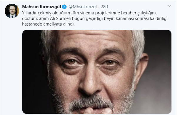''Yıllardır çekmiş olduğum tüm sinema projelerimde beraber çalıştığım, dostum, abim Ali Sürmeli bugün geçirdiği beyin kanaması sonrası kaldırılığı hastanede ameliyata alındı.''