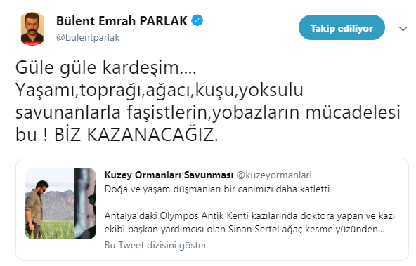 Güle güle kardeşim.... Yaşamı,toprağı,ağacı,kuşu,yoksulu savunanlarla faşistlerin,yobazların mücadelesi bu ! BİZ KAZANACAĞIZ.