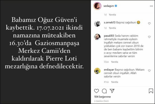 Güven paylaşımında, “Babamız Oğuz Güven’i kaybettik. 17.07.2021 ikindi namazına müteakiben Gaziosmanpaşa Merkez Camii’den kaldırılarak, Pierre Loti mezarlığına defnedilecektir” ifadelerini kullandı.