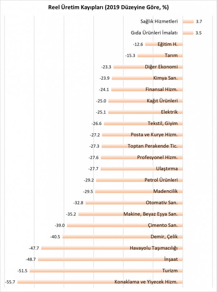 - Öncelikle “kısıtlanan” hava yolu taşımacılığı, konaklama ve yiyecek hizmetleri ve turizm sektörlerinde ilk talep şokunun (özel tüketim ve ihracat) neden olduğu daralma yüzde 61.