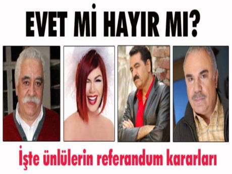 İBRAHİM TATLISES: Bir sosyal demokrat olarak artık çürümüş tahtalar içindeki tüm paslanmış çivilerin değişmesi gerektiğini düşünenTatlıses, 'Teknoloji değişti, hayat değişti, ama Türkiye Cumhuriyeti hala aynı kanunlarla yürüyor. Tahtaları yenileyelim, çivileri değiştirelim, yeni anayasaya 'EVET' diyelim. Dış ülkeler de bize 'bunların tahtası da çürümüş, çivisi de çürümüş' demesinler... Yani 'tahtası eksik' demesinler' dedi.