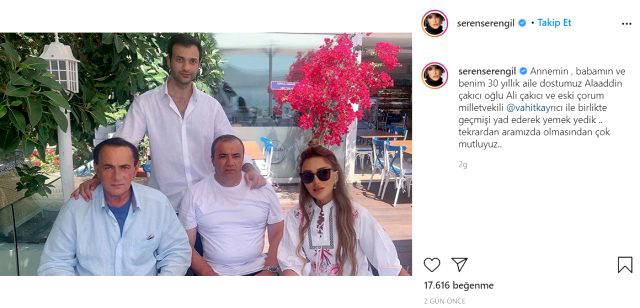 Serengil fotoğrafın altına da "Annemin, babamın ve benim 30 yıllık aile dostumuz Alaattin Çakıcı oğlu Ali Çakıcı ve eski Çorum milletvekili @vahitkayrıcı ile birlikte geçmişi yad ederek yemek yedik. Tekrardan aramızda olmasından çok mutluyuz" diye yazmıştı.