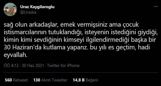 "Sağ olun arkadaşlar, emek vermişsiniz ama çocuk istismarcılarının tutuklandığı, isteyenin istediğini giydiği, kimin kimi sevdiğinin kimseyi ilgilendirmediği başka bir 30 Haziran’da kutlama yaparız. bu yılı es geçtim, hadi eyvallah."