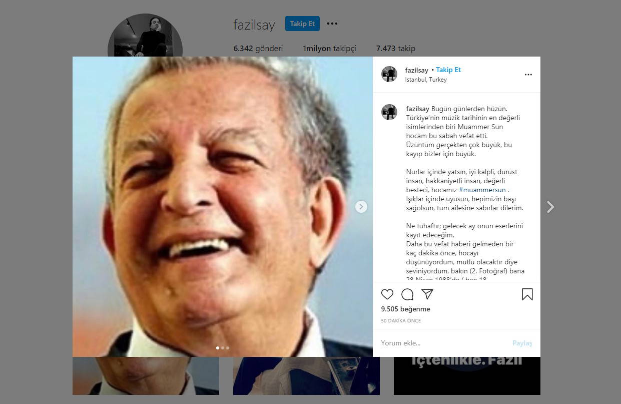 Piyanist ve besteci Fazıl Say "Bugün günlerden hüzün. Türkiye’nin müzik tarihinin en değerli isimlerinden biri Muammer Sun hocam bu sabah vefat etti. Üzüntüm gerçekten çok büyük, bu kayıp bizler için büyük" ifadelerine yer verdiği paylaşımında şunları söyledi: