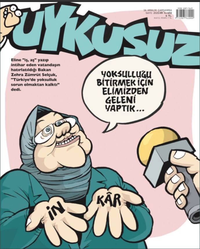 Uykusuz Dergisi, Samsun’da eline “iş” ve “aş” yazarak kendisini asan yurttaşın hatırlatılmasının ardından “Türkiye’de yoksulluk sorun olmaktan çıktı” diyen Aile, Çalışma ve Sosyal Hizmetler Bakanı Zehra Zümrüt Selçuk'a göndermede bulundu.