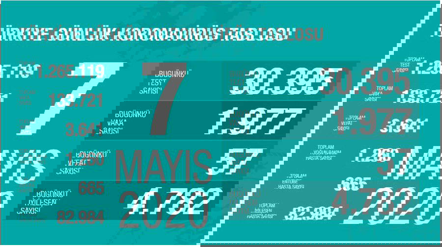 Türkiye'de 11 Mart'tan bu yana koronavirüsten yaşamını yitirenlerin toplam sayısı 3 bin 641'e yükseldi. Son 24 saatte 57 kişi yaşamını yitirirken iyileşenlerin toplam sayısı ise 82 984'e yükseldi.