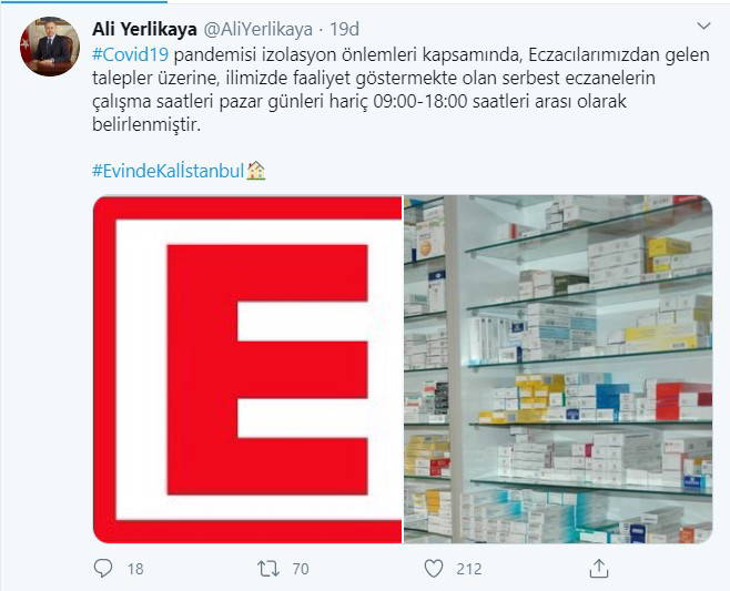 Yerlikaya, Twitter hesabından yaptığı açıklamada eczane çalışma saatlerinde düzenleme yapıldığını belirterek, “Covid-19 pandemisi izolasyon önlemleri kapsamında, Eczacılarımızdan gelen talepler üzerine, ilimizde faaliyet göstermekte olan serbest eczanelerin çalışma saatleri pazar günleri hariç 09:00-18:00 saatleri arası olarak belirlenmiştir." ifadesini kullandı.