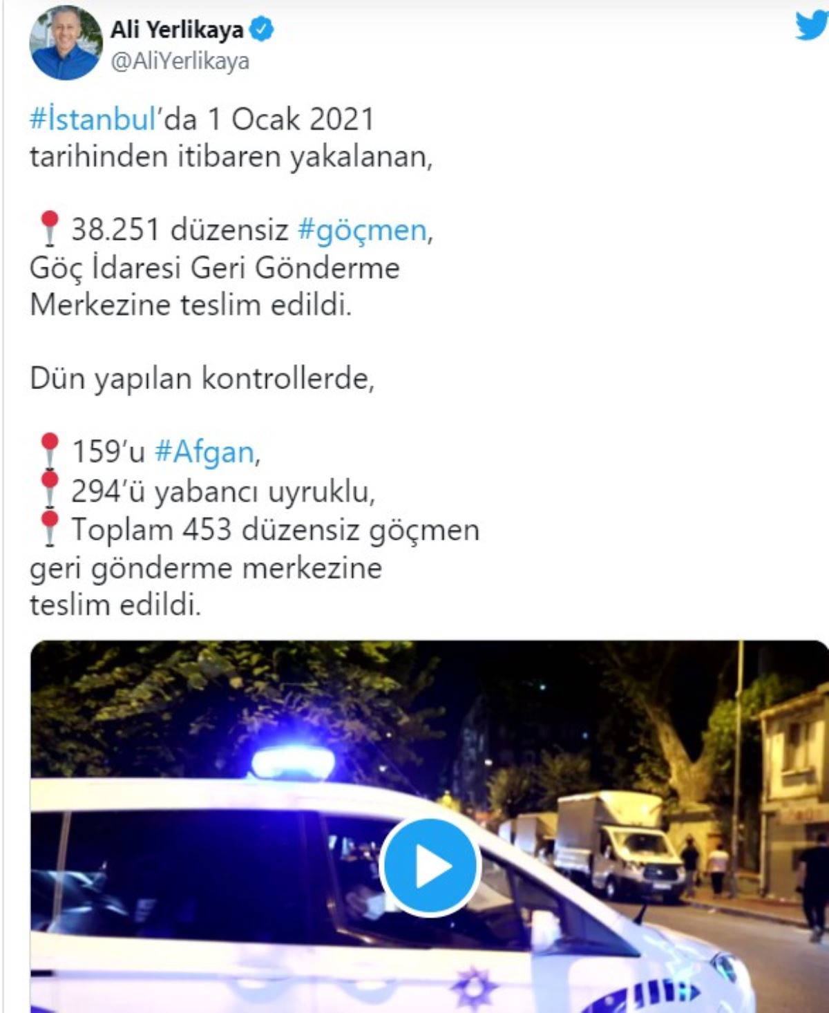 İstanbul Valisi Ali Yerlikaya, 1 Ocak 2021 itibaren İstanbul genelinde 38 bin 251 düzensiz göçmenin yakalanarak Göç İdaresi Geri Gönderme Merkezine gönderildiğini duyurdu.