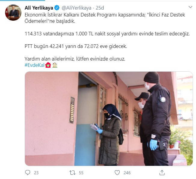İstanbul Valisi Ali Yerlikaya sosyal medya hesabından yaptığı paylaşımla ikinci faz destek ödemelerinin başladığını açıkladı. Vali Yerlikaya'nın paylaşımında, "Ekonomik İstikrar Kalkanı Destek Programı kapsamında; "İkinci Faz Destek Ödemeleri"ne başladık. 114.313 vatandaşımıza 1.000 TL nakit sosyal yardımı evinde teslim edeceğiz. PTT bugün 42.241 yarın da 72.072 eve gidecek. Yardım alan ailelerimiz, lütfen evinizde olunuz" ifadeleri yer aldı.