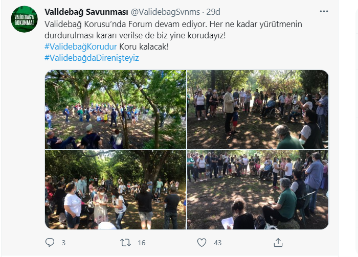 Üsküdar Belediyesi'nin Validebağ Korusu'na yönelik hazırladığı imar planına mahkeme dur dedi ve yürütmeyi durdurma kararı verdi. Validebağ Savunması, Twitter hesabından yaptığı paylaşımda, "Validebağ Korusu’nda Forum devam ediyor. Her ne kadar yürütmenin durdurulması kararı verilse de biz yine korudayız!" açıklaması yaptı.