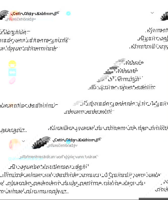 "Kıymetli Elazığlılar; bugün salgında yeni döneme girdik. Kontrollü sosyal hayat döneminde; maske, mesafe ve el temizliğine riayet edelim. İl dışından gelenler için 14 gün karantina tedbirimiz devam edecek. Kurallara uyarak bu dönemi de hep birlikte aşacağız. İlimizde alınan sıkı tedbirler sonucu 10 gündür yeni vaka yok, dışarıdan gelenlerin bulaş getirme riskine karşı bu önlemi almak durumundayız."