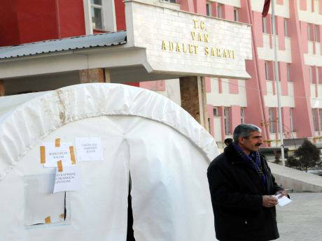 Van'da 23 Ekim ve 9 Kasım'da meydana gelen depremlerde hasar gören, Çevre ve Şehircilik Bakanlığı görevlilerince ''az hasarlı raporu'' verilen Van Adliye binasındaki müracaat savcılığı ve mahkeme kalemleri çadırlarda acil durumlar için hizmet vermeye devam ediyor.