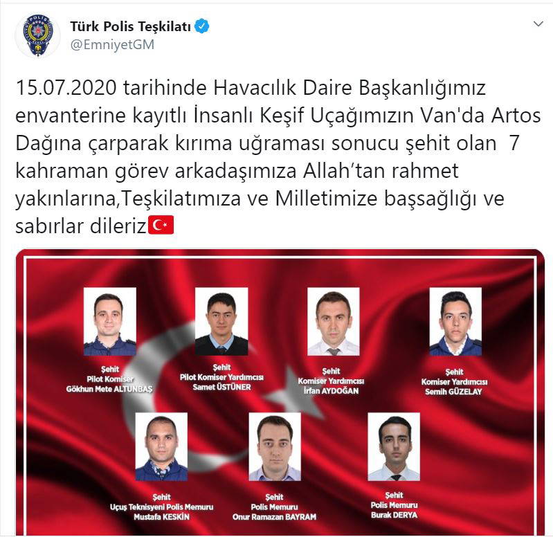 Emniyet Genel Müdürlüğü, şehit olan 7 polisin ismini açıklayarak, yakınlarına başsağlığı diledi. Emniyet Genel Müdürlüğü'nün Twitter hesabından yapılan açıklamada, "15.07.2020 tarihinde Havacılık Daire Başkanlığımız envanterine kayıtlı İnsanlı Keşif Uçağımızın Van'da Artos Dağı'na çarparak kırıma uğraması sonucu şehit olan 7 kahraman görev arkadaşımıza Allah'tan rahmet yakınlarına, teşkilatımıza ve milletimize başsağlığı ve sabırlar dileriz" denildi.