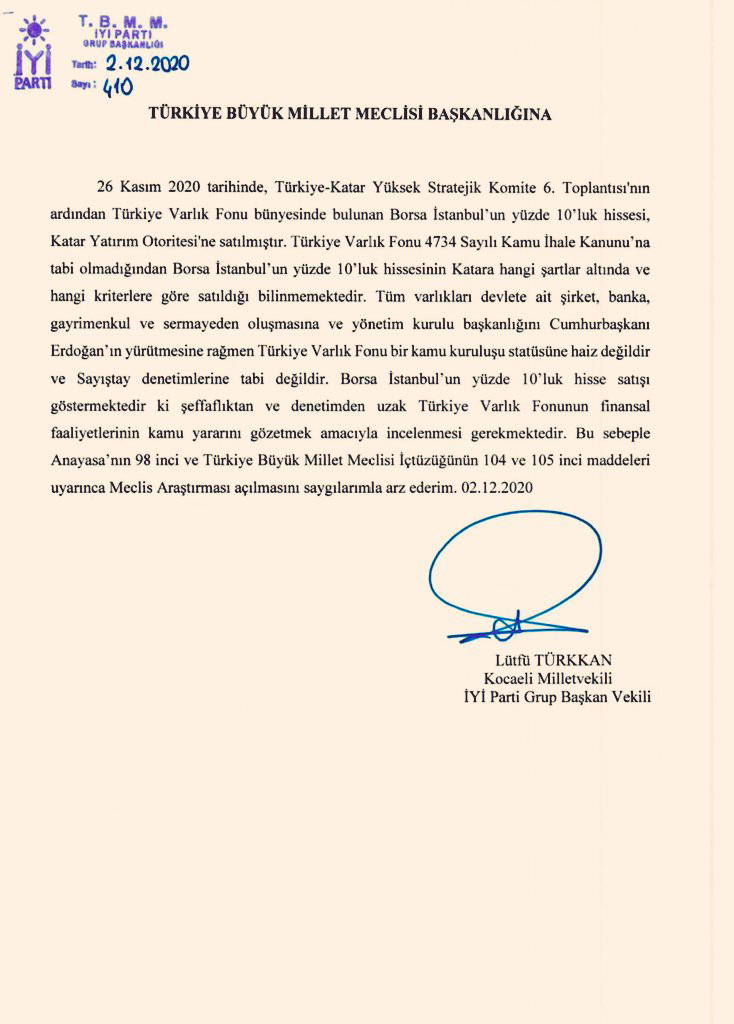 İYİ Parti Kocaeli Milletvekili Lütfü Türkkan TBMM Başkanlığı'na, "Türkiye Varlık Fonu'nun kamu yararı gözetmeyen finansal faaliyetlerinin incelenmesi" yönünde araştırma önergesi verdi. Önerge AKP ve MHP milletvekillerinin oylarıyla reddedildi.