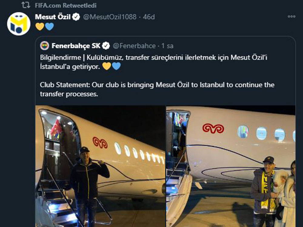 FIFA'nın resmi Twitter hesabı, Mesut'un Fenerbahçe'nin açıklamasını paylaştığı mesajını "retweet" etti.