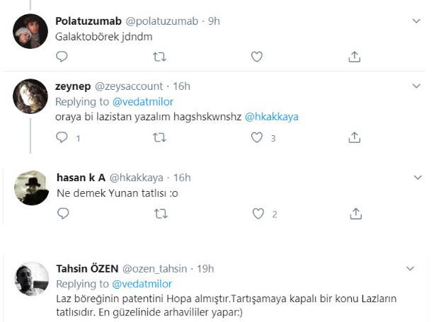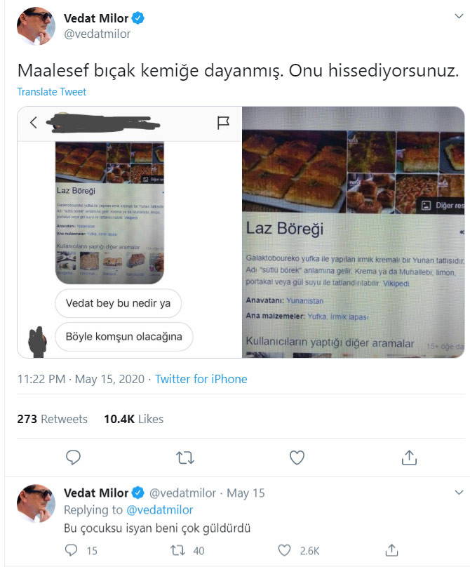 Vedat Milor’a bir takipçisi, Wikipedia’da Laz Böreği ile ilgili Yunanistan’a ait bir tatlı olduğu bilgisi yer aldığının ekran görüntüsünü gönderip “Vedat Bey bu nedir ya böyle komşu olacağına” diye yazdı.