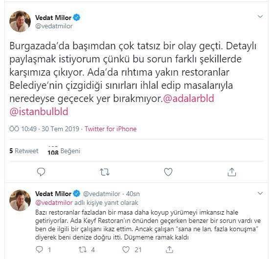 Vedat Milor'ün paylaşımı söyle: Bazı restoranlar fazladan bir masa daha koyup yürümeyi imkansız hale getiriyorlar. Ada Keyf Restoran’ın önünden geçerken benzer bir sorun vardı ve ben de ilgili bir çalışanı ikaz ettim. Ancak çalışan “sana ne lan, fazla konuşma” diyerek beni denize doğru itti. Düşmeme ramak kaldı. Burgazada’da başımdan çok tatsız bir olay geçti. Detaylı paylaşmak istiyorum çünkü bu sorun farklı şekillerde karşımıza çıkıyor. Ada’da rıhtıma yakın restoranlar Belediye’nin çizgidiği sınırları ihlal edip masalarıyla neredeyse geçecek yer bırakmıyor.