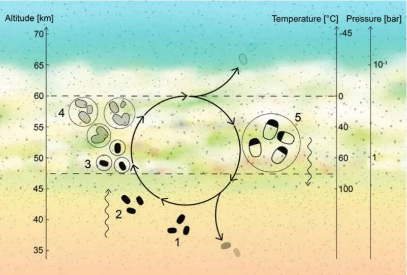 Venüs atmosferindeki organizmalar için olası bir yaşam döngüsü. (1) Dehidre olmuş mikroplar, Venüs atmosferinin alt tabakalarında vejetatif bir durumda yaşıyor olabilir. (2) Bunların sporları, yükselen akımlarla daha yaşanabilir bulut katmanlarına taşınabilir. (3) Sıvıyla enkapsüle olan sporlar, metabolik olarak aktif hale geçebilir. (4) Bu mikroplar bölünürler ve damlacıklar, koagülasyon yoluyla büyürler. (5) Damlacıklar yeterince büyüyünce, atmosfer içinde batmaya başlarlar ve aşağılara indikçe artan sıcaklıklar dolayısıyla buharlaşırlar. Bu durum, mikropları sporlara dönüşmeye zorlar ve bunlar, en baştaki gibi alt katmanlarda vejetatif halde bekler. Kaynak: AstrobiologyFosfin (PH3), balık veya sarımsak gibi kokan, renksiz bir gazdır. -87.7 derecede kaynar, -133 derecede donar. Çok düşük konsantrasyonlarda bile solunması ölümcül olabilir. Fosfinin büyük bir kısmı, canlıların vücudunda bulunan organik yapılı bileşiklerin oksijensiz ortamda bozunması sırasında fosfatın parçalanmasıyla oluşur. Geri kalanı ise laboratuvar şartlarında üretilmektedir. Organizmalar fosfini üretebilmek için fosfat minerallerini emerler, hidrojen eklerler ve fosfin çıkarırlar. Venüs atmosferinde hiç oksijen olmaması, bu gazın bu tür mikroplardan geliyor olma ihtimalini arttırıyor.