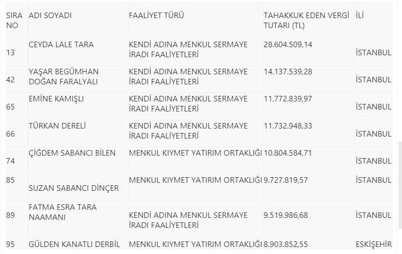 Kadın rekortmenler listesinde dikkati çeken isimlerden biri, Tara Holding ortaklarından Ceyda Lale Tara oldu. Tara, kendi adına menkul sermaye iradı faaliyetleri alanında tahakkuk ettirilen 28 milyon 604 bin 509 liralık vergiyle listenin 13'üncü sırasında yer aldı. Tara, 2018 yılına ilişkin listede bulunmuyordu.
