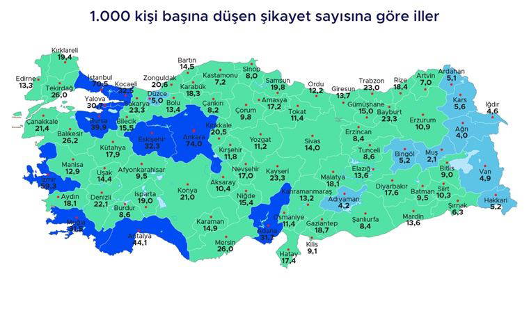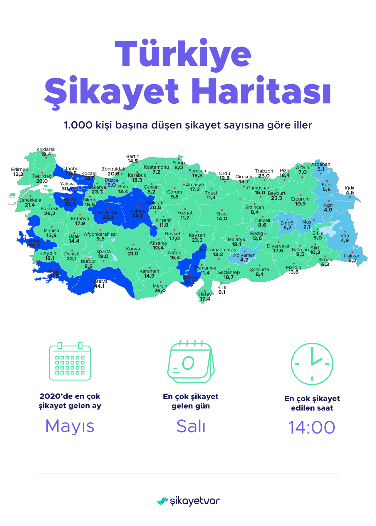 Şikayetvar verilerine göre Ankara 2020’de şikayetin en yoğun olduğu il oldu. Başkent Ankara’da her bin kişiye 74 şikayet düşerken, İstanbul’da bu oran 70 oldu… İzmir ise her bin kişiye düşen 60 şikayet sayısıyla üçüncü sırada yer aldı. Üç metropolü sırasıyla Antalya, Bursa, Kocaeli, Eskişehir ve Adana takip etti.