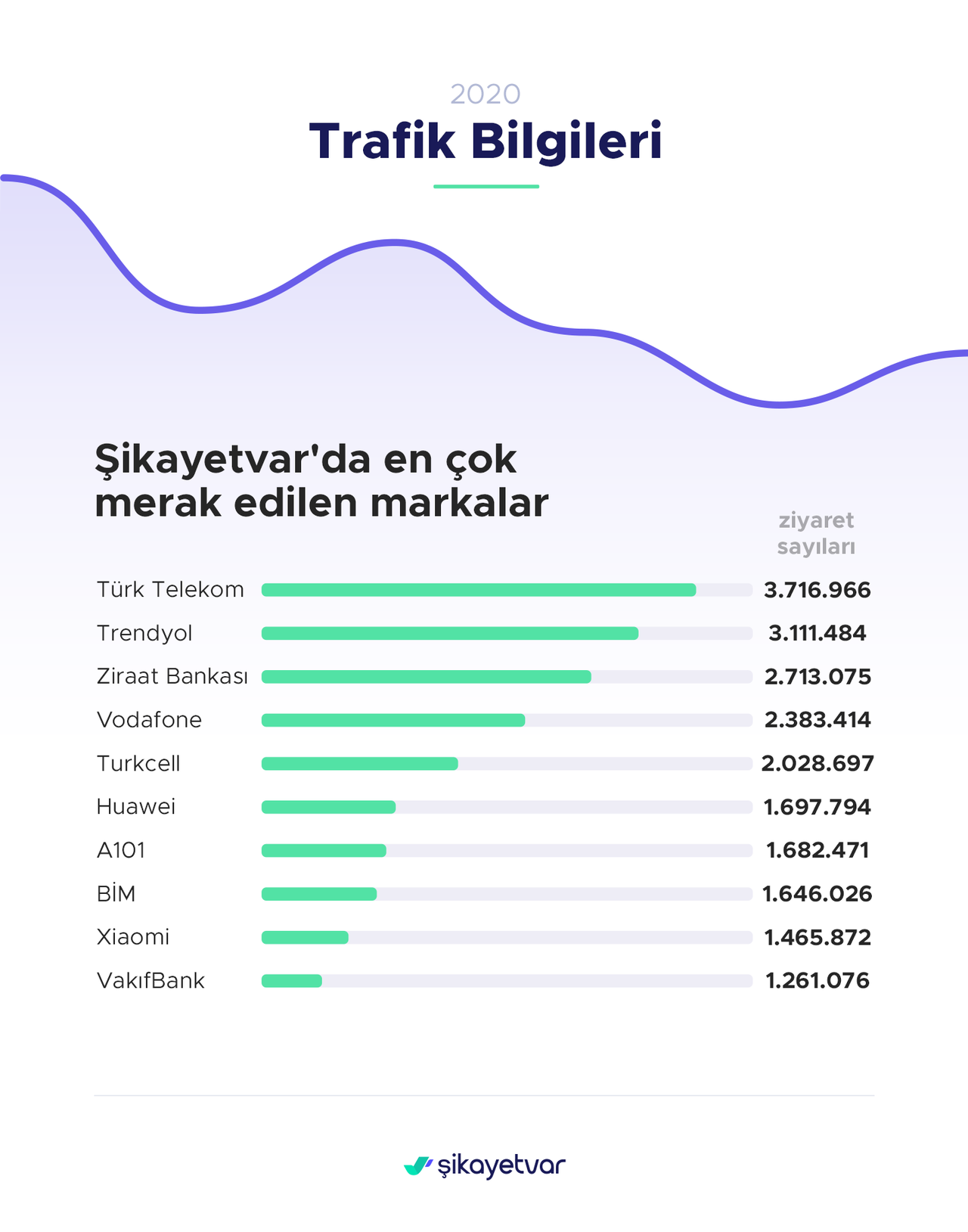 2020 yılı verilerini derleyen Şikayetvar’da, sayfası en çok merak edilen marka 3 milyon 716 bin 966 sayfa görüntülenmesiyle Türk Telekom oldu. Türk Telekom’u, Trendyol, Ziraat Bankası, Vodafone ve Turkcell izledi.