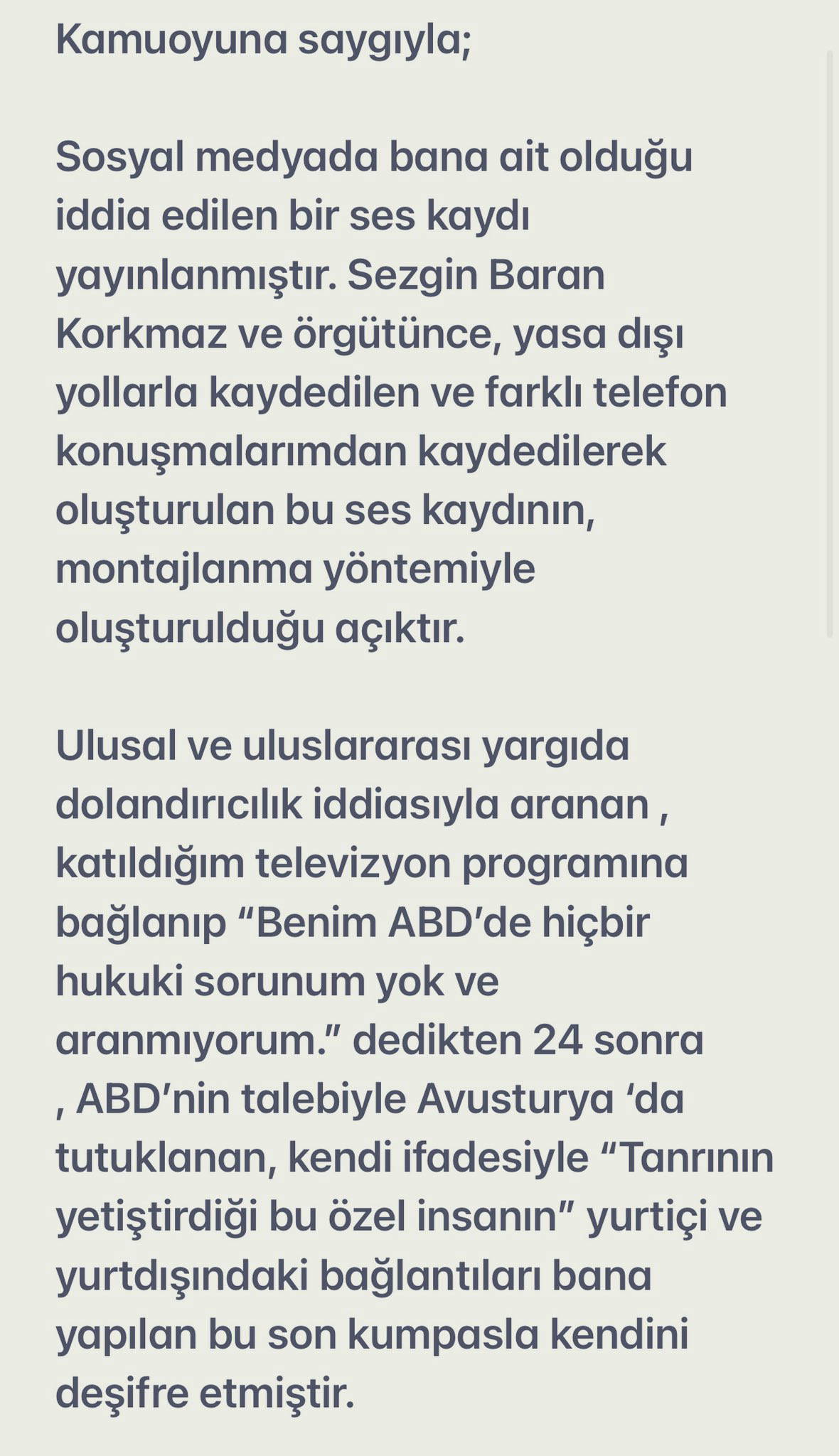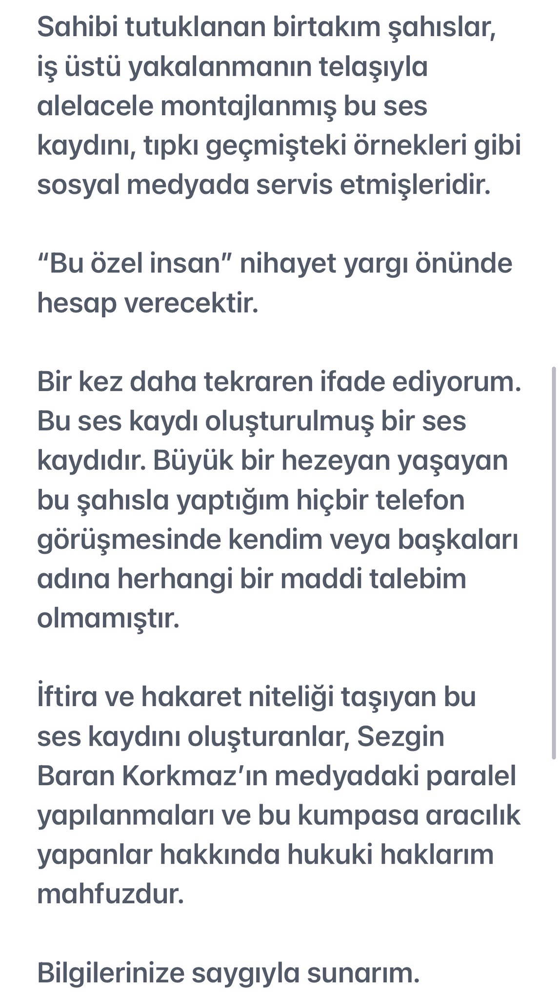 Ateş açıklamasında, “Sezgin Baran Korkmaz ve örgütünce, yasa dışı yollarla kaydedilen ve farklı telefon konuşmalarımdan kaydedilerek oluşturulan bu ses kaydının, montajlanma yöntemiyle oluşturulduğu açıktır” ifadelerini kullandı. Ateş devamında, “Bu kumpasa aracılık yapanlar hakkında hukuki haklarım mahfuzdur” dedi.