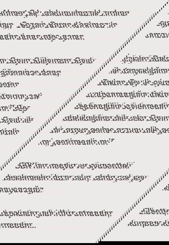 Ahmet Şık’a seslenen Ateş, “Dokunulmazlık zırhına sığınıp, Sezgin Baran korkmaz omzundan bana ateş açma” diye belirtti.