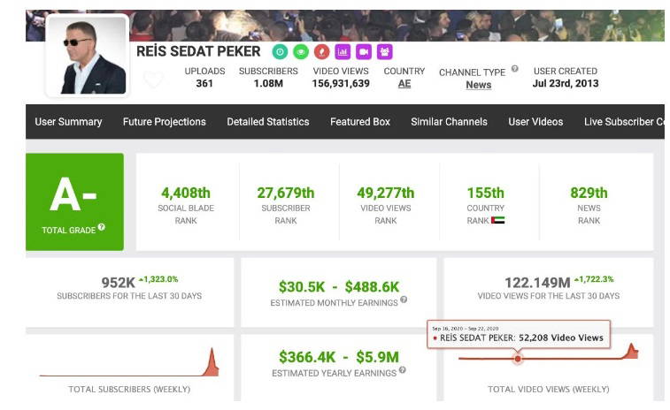 Habere göre Social Blade verileri, Sedat Peker'in halihazırda 1,08 milyon abonesi, 156,9 milyon toplam video izlenmesi bulunduğunu gösteriyor. Bu veriler hem Peker'in YouTube gelirinin ne kadar olduğunu hesaplamayı, hem de Peker'in aylık ve yıllık ortalama gelir potansiyelini görülebilmesini sağlıyor.