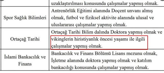 Çorum Hitit Üniversitesi, Resmi Gazete'ye verdiği öğretim ilanında, Fen Edebiyat Fakültesi Tarih Bölümü Ortaçağ Tarihi Anabilim Dalı Doktor Öğretim Üyesi kadrosuna başvuracak adaylar için; "ortaçağ tarihi bilim dalında doktora yapmış olmak ve Vikinglerin Hıristiyanlık öncesi yaşamı ile ilgili çalışmalar yapmış olmak" şartı koydu.