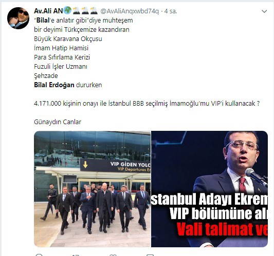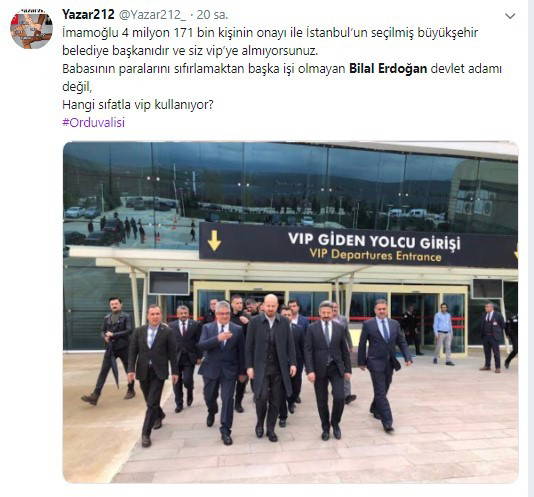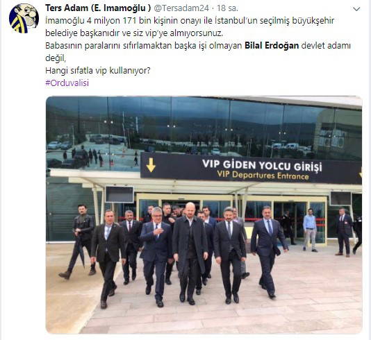 İstanbul'un seçilmiş Belediye Başkanı Ekrem İmamoğlu'nun Ordu'da CHP'li vekille birlikte VIP salonuna alınmamasının yankıları sürerken vali dava açtı. Sosyal medya kullanıcıları ise Bilal Erdoğan'ın VIP'ten geçtiği anı gösteren fotoğrafla yaşananları eleştirdi.