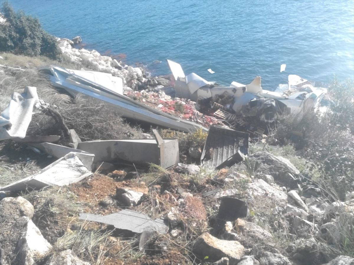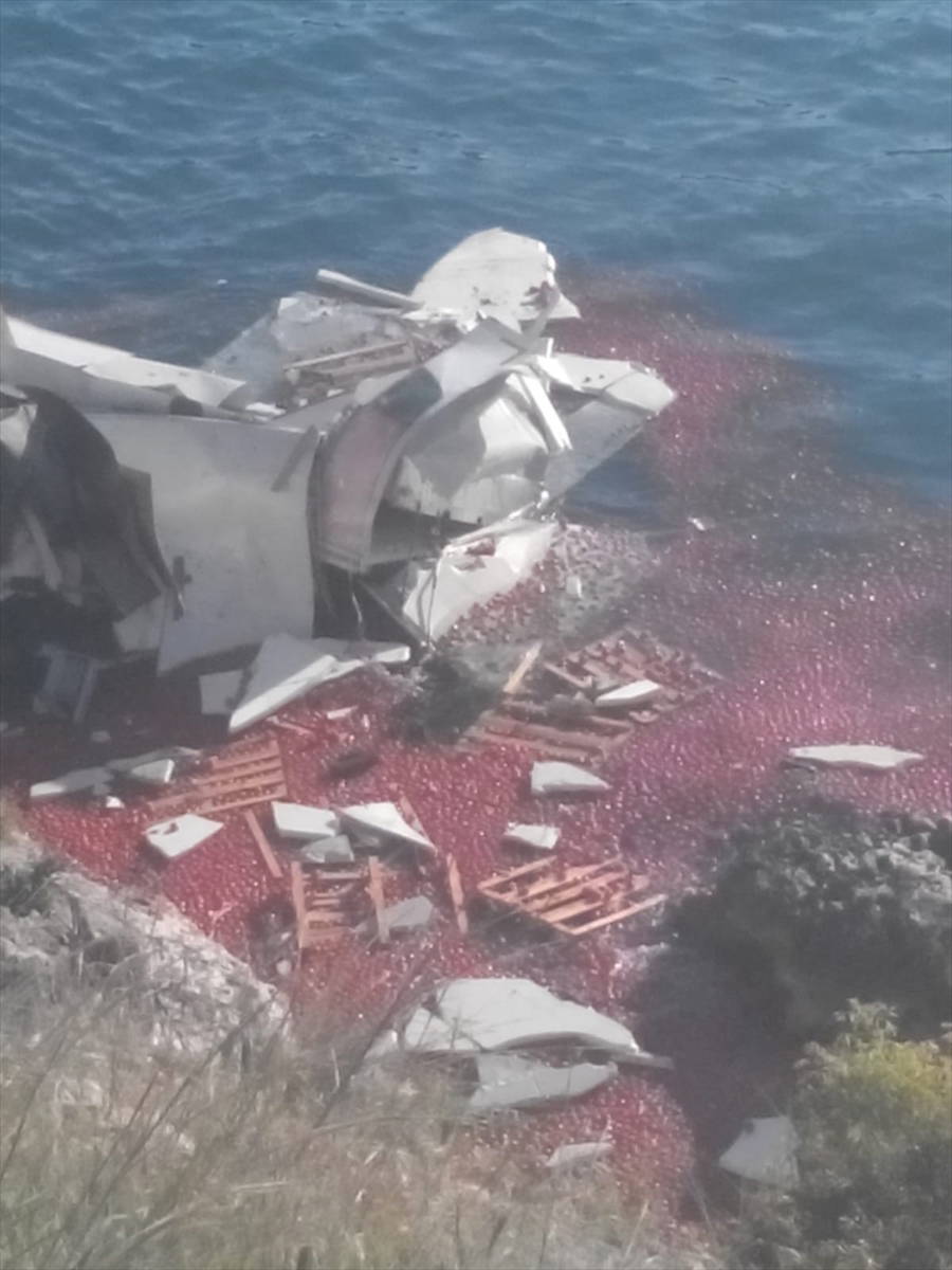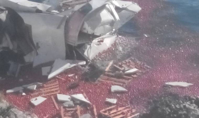 Fais Kartal (39) idaresindeki 33 DCA 01 plakalı domates yüklü TIR, Atakent Mahallesi çıkışında yağış nedeniyle kayganlaşan yolda virajı alamayarak denize düştü.