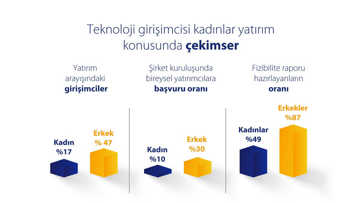 Araştırma, kadın teknoloji girişimcilerinin yatırıma yönelik yaklaşımları ve bilgi düzeyleri ile ilgili pek çok veriye de ışık tutuyor. Araştırmaya göre kadın teknoloji girişimcilerinin yalnızca %17’si yatırım arayışında iken, bu oran erkeklerde %47. Kadınlardan, girişimlerini kurmak için yatırımcı desteğine başvuranların oranı ise %10 gibi düşük bir seviyede. Aynı oran, erkek teknoloji girişimcilerinde üç katına çıkıyor.